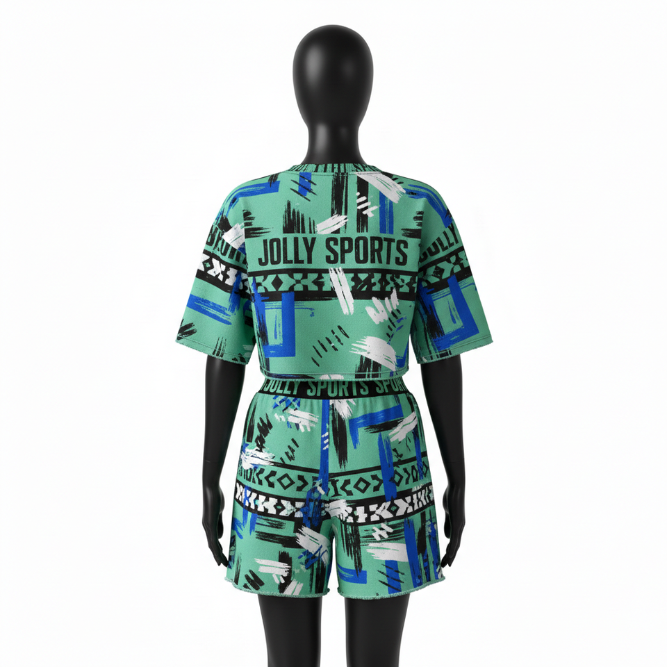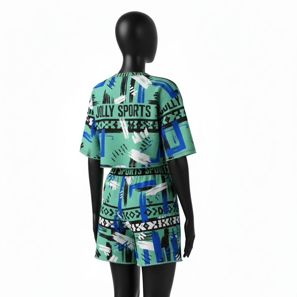 Ensemble Crop Top et Short pour Femmes en Polyester Spandex Extensible Lisse Vert Bleu Sublimation Intégrale Logo 100% Coton Crop Top & Short