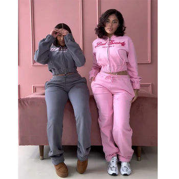 Ensemble de survêtement deux pièces pour femmes, coupe courte, en coton, avec logo personnalisé, comprenant un sweat à capuche zippé et un pantalon de jogging