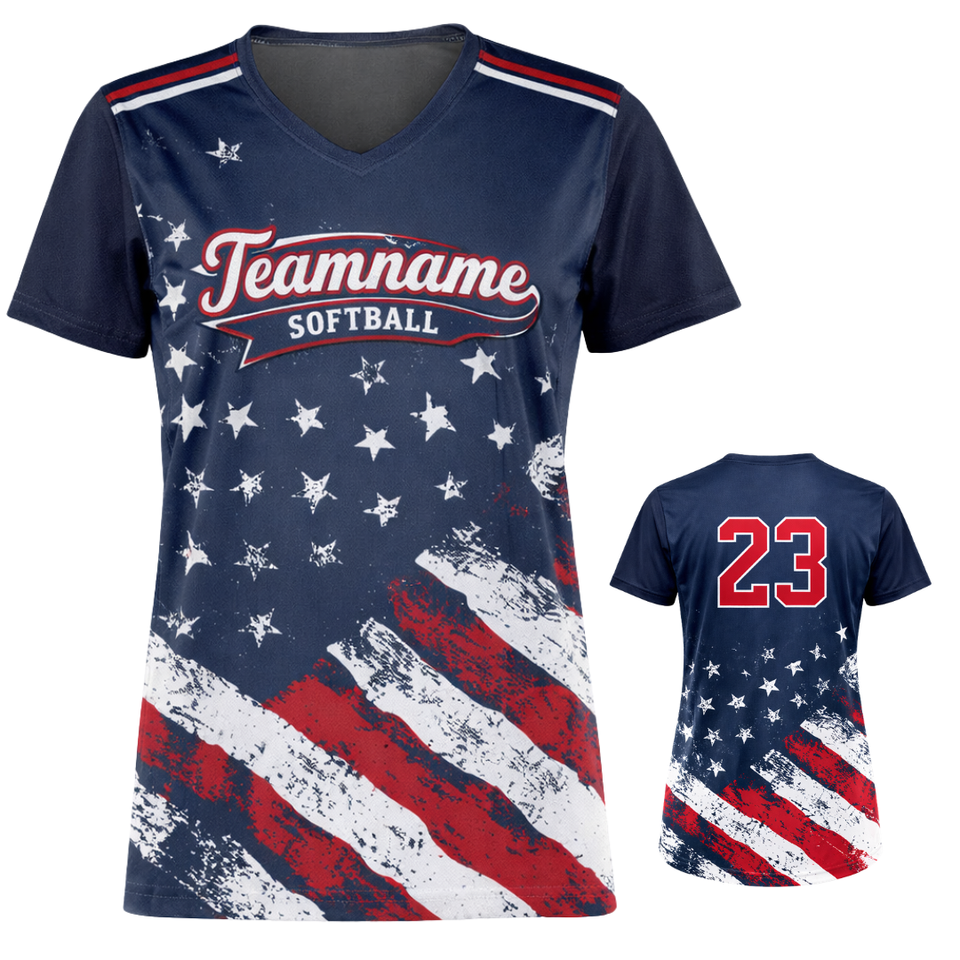 Maillot de softball pour femmes, coupe ajustée, sublimation intégrale, motif drapeau patriotique bleu marine, numéro d'équipe personnalisé au dos