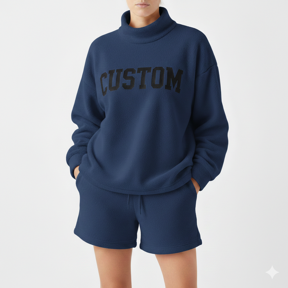 Ensemble coordonné décontracté et contemporain pour femme : Haut à col montant et épaules tombantes à manches longues, longueur standard, et short au-dessus du genou – Collection Hiver