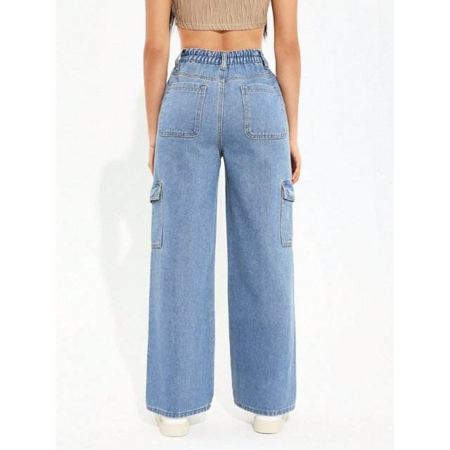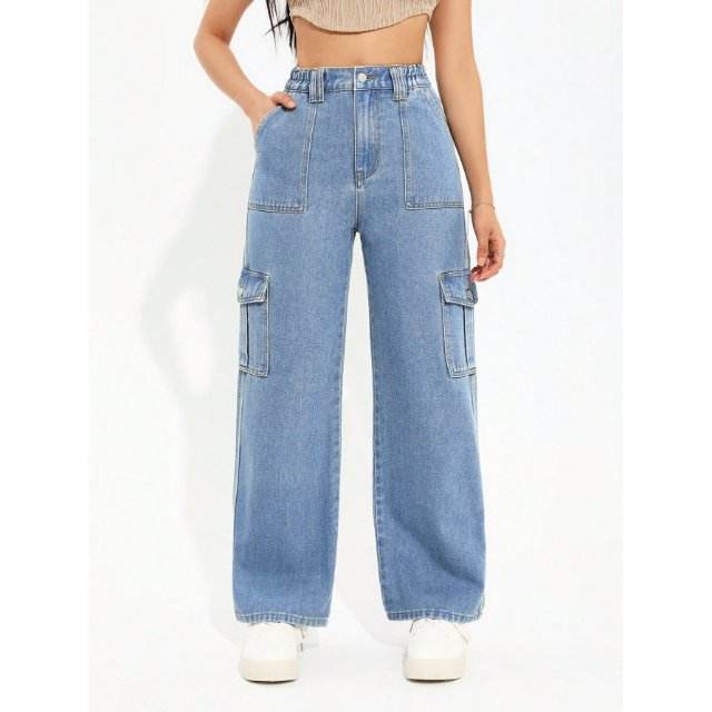 Pantalon cargo en jean stretch écologique de luxe taille haute Y2K bleu glace pour femme, multipoches, coupe droite, style décontracté urbain