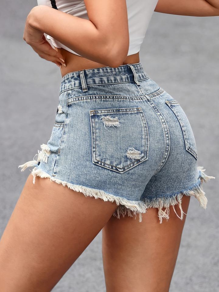 Shorts en jean déchiré bleu clair à franges pour femme, taille mi-haute, coupe skinny, respirant, style rétro décontracté, sexy, effet push-up fessier