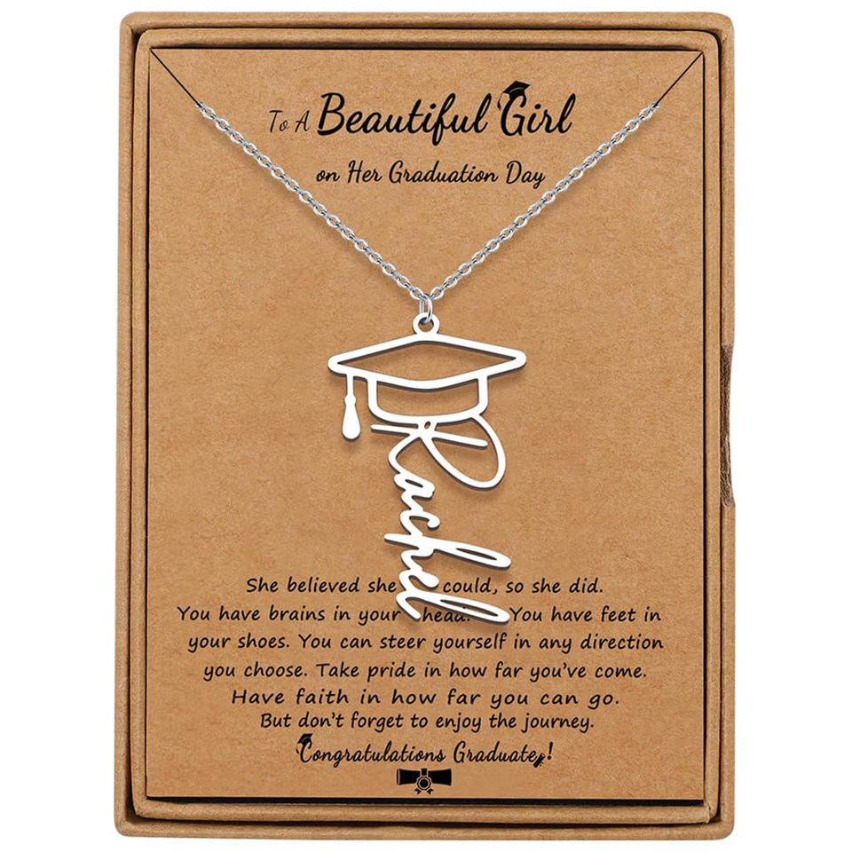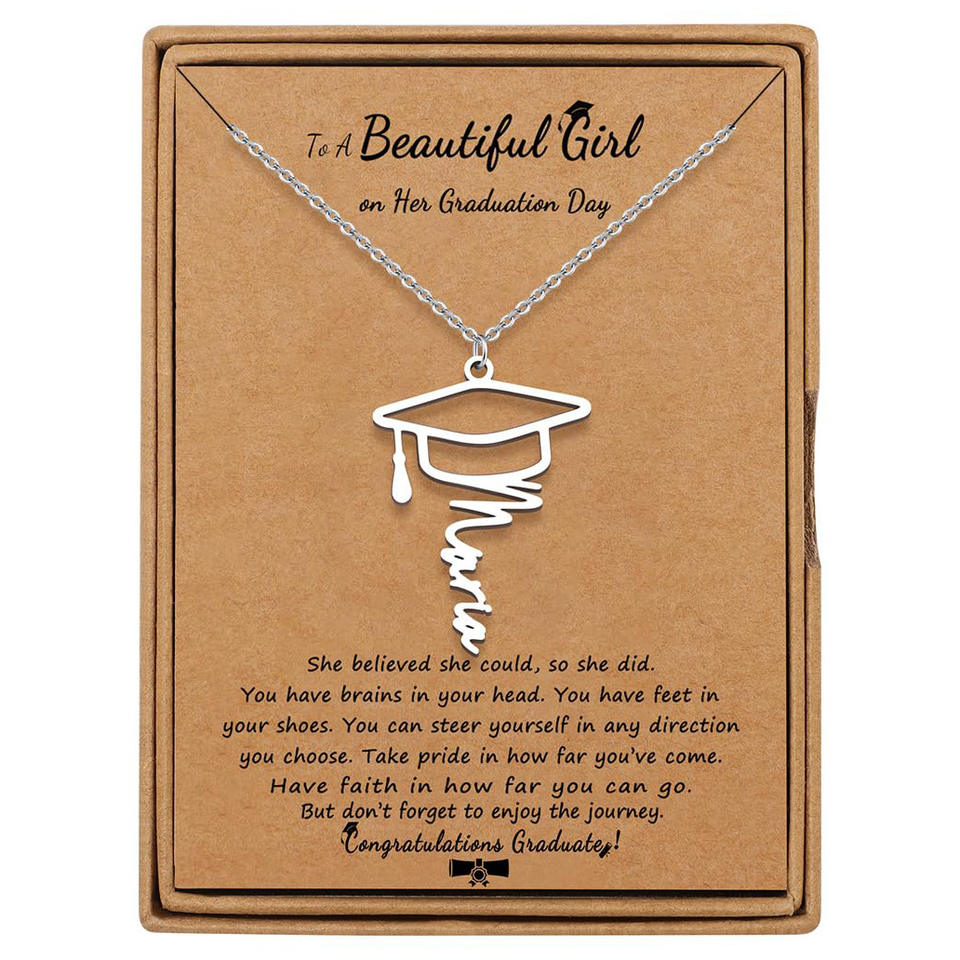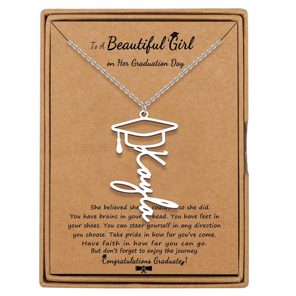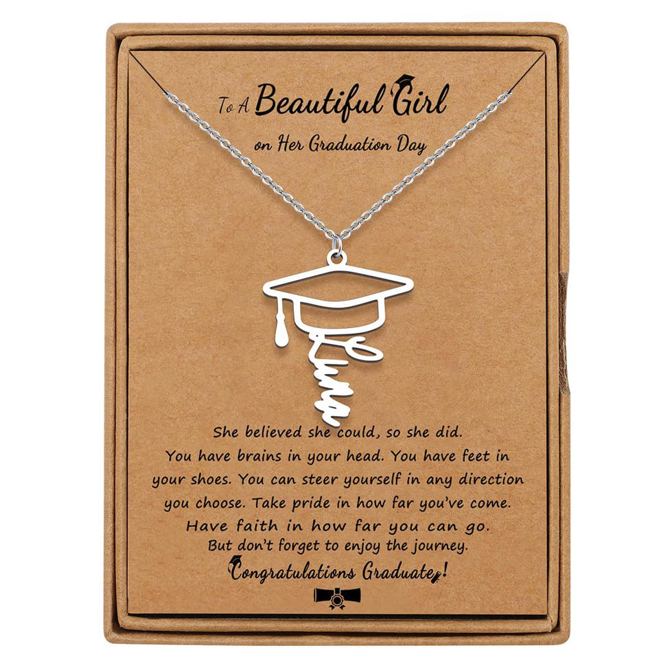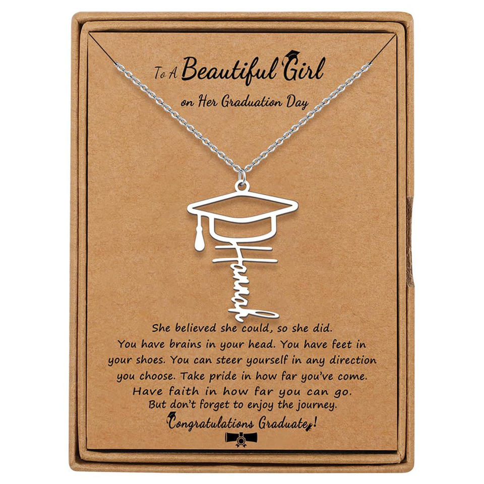 Collier en acier inoxydable pour dames pour la saison des diplômes Chapeau creux avec lettre anglaise Chaîne croisée Bouddhisme Chaîne à maillons Cadeau pour femmes