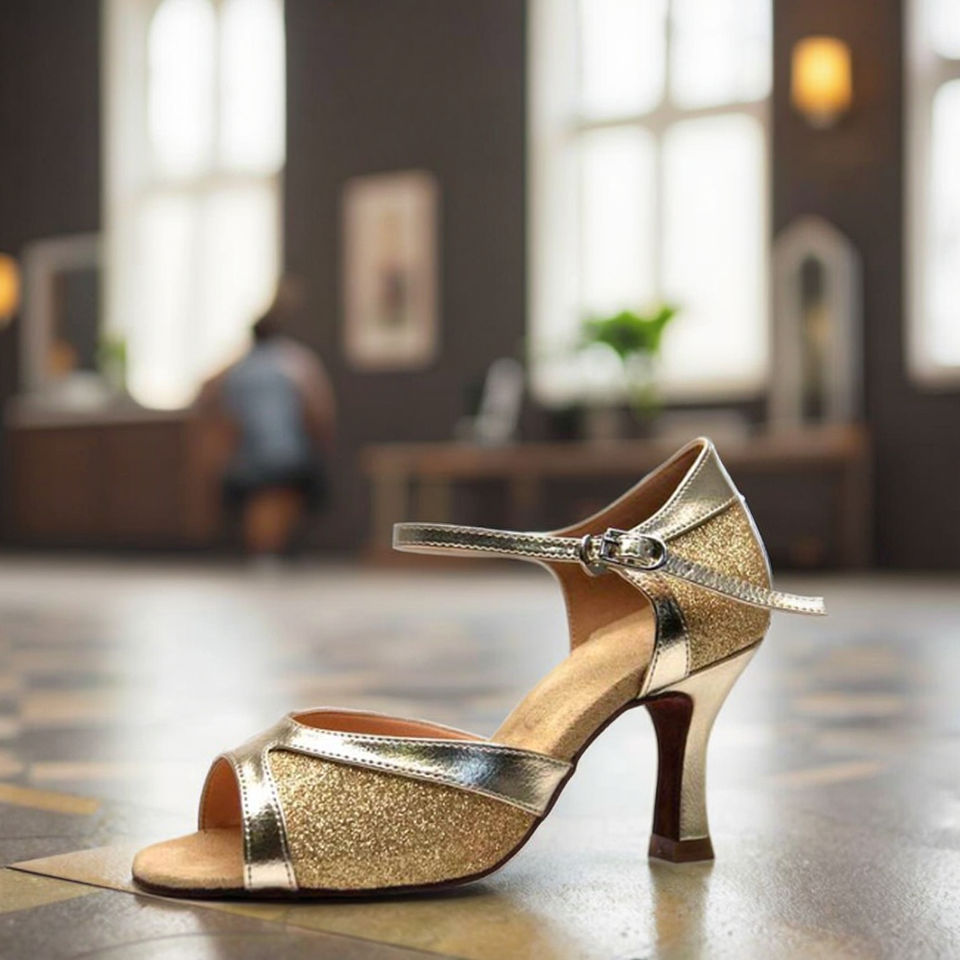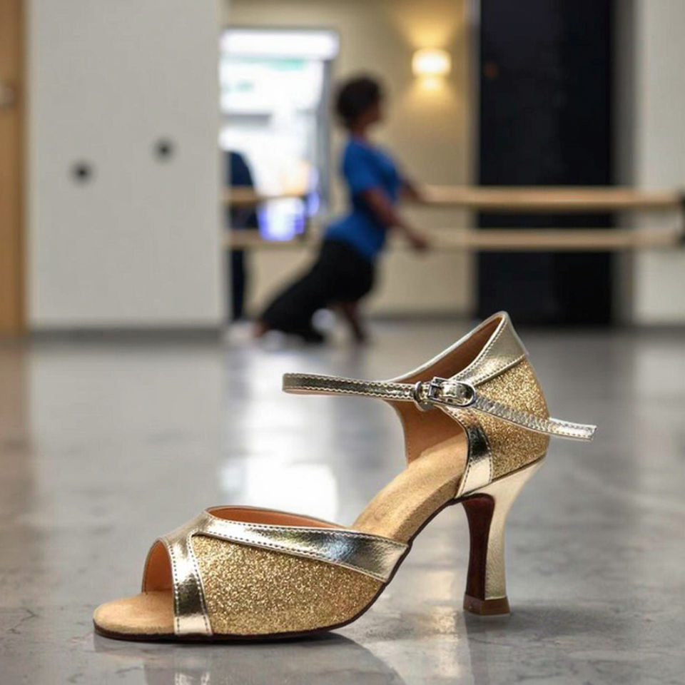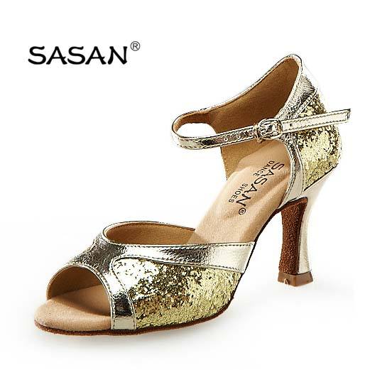 Lady Gold Latin Dance Shoes Salsa Wedding Shoes S-31 Soft Lace-up Style avec paillettes en cuir véritable et doublure en coton