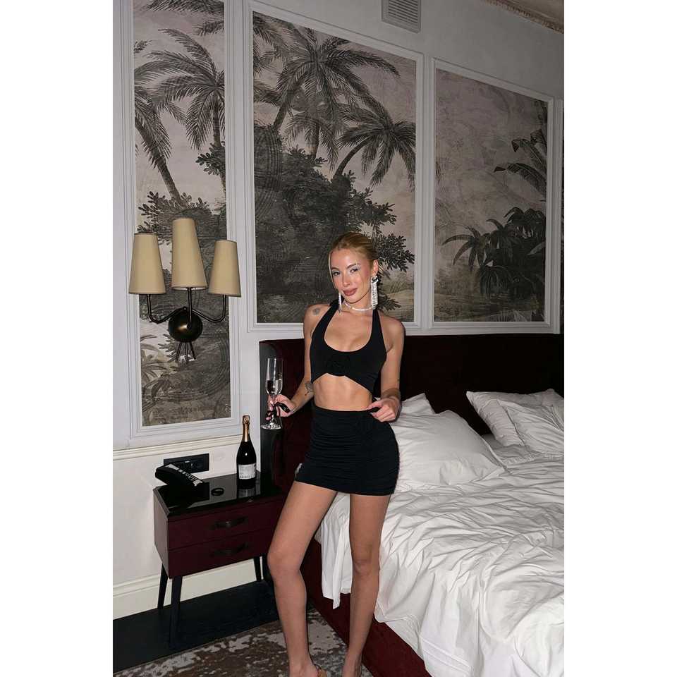 Ensemble jupe et haut de bureau formel pour femme, noir avec détail rose, longueur au-dessus du genou, ensemble 2 pièces comprenant un haut