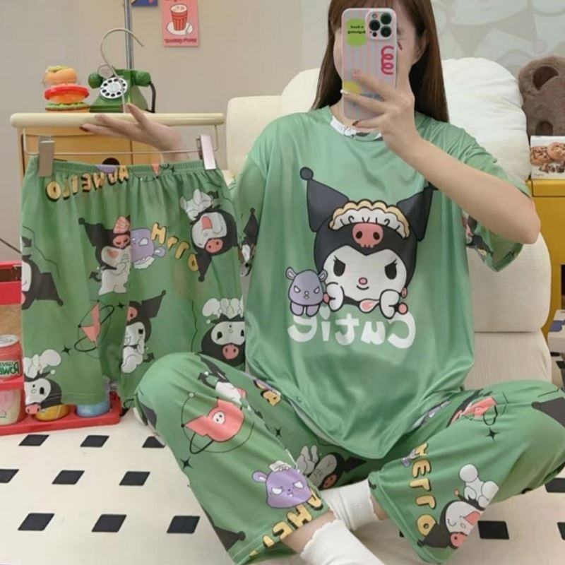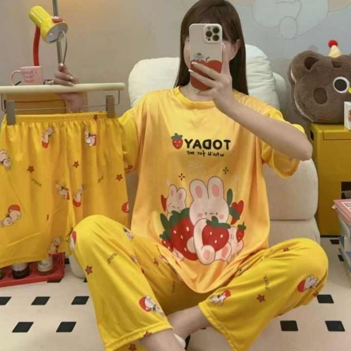 Vêtements de nuit trois pièces pour femmes Summer Cheap Short Sleeve Pant Shorts 3 In1 Nightie Korean Soft Home Nightwear Cartoons Baju Tidur