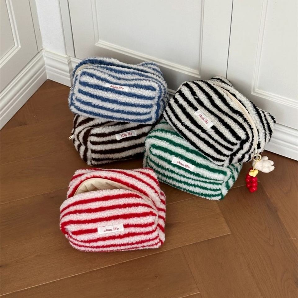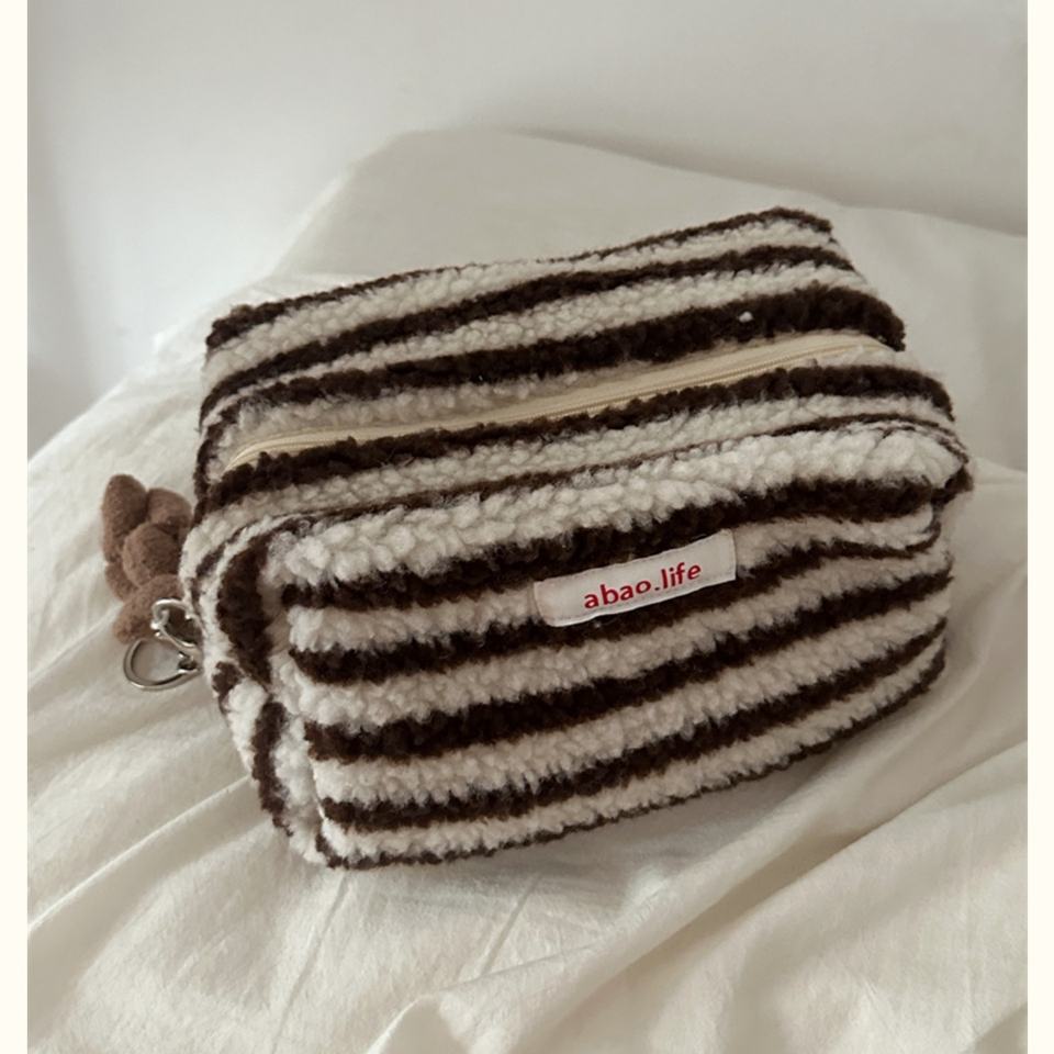 Trousse de toilette en laine d'agneau Étiquette lavable Remplissage en coton doux pour l'hiver Trousse de toilette portable Pochette multi-rayures Grande capacité