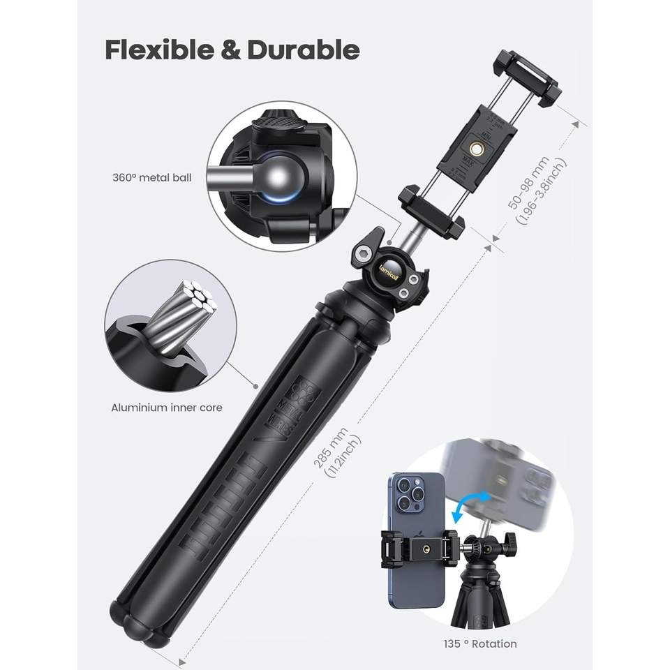 Lamicall 3-in-1 Flexible iPhone Tripod with Wireless Remote Alloy Stand Pan Heads Black 11-inch Max Height for Video Recording