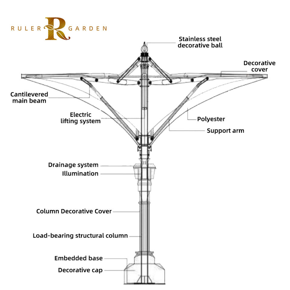 Parapluie motorisé pour paysage, résistant au vent, imperméable, à l'énergie solaire, pulvérisant un café, un bar, un espace carré pour l'extérieur.