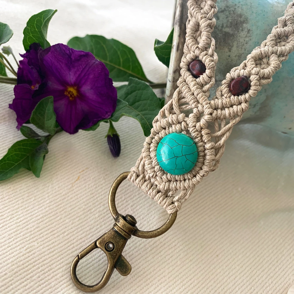 Cordon en polyester tricoté personnalisé avec pendentif en pierre turquoise pour clés, badges et téléphones, idéal pour la personnalisation DIY