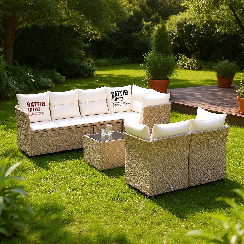 Ensemble de canapés de jardin en rotin beige, rotin PE, 6 places, mobilier d'extérieur, design contemporain, pieds réglables
