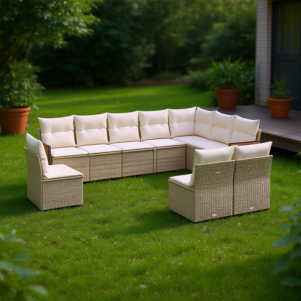 Grand ensemble de canapés de jardin en rotin PE beige 6 places, mobilier d'extérieur réglable au design contemporain