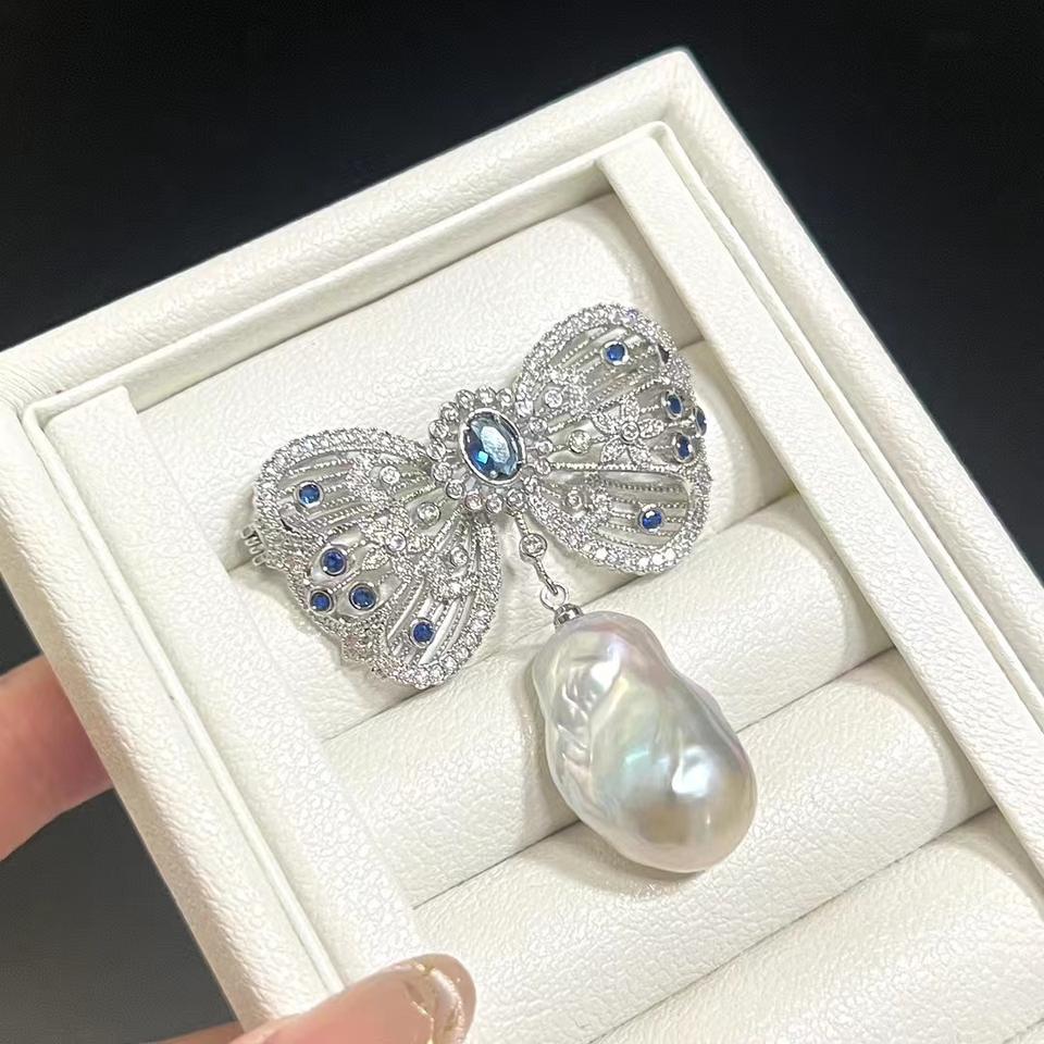 Broche en forme de baroque avec perle d'eau douce de grande taille, incrustation de zirconium bleu, fleur de poitrine, nœud, motif lisse irrégulier, broches
