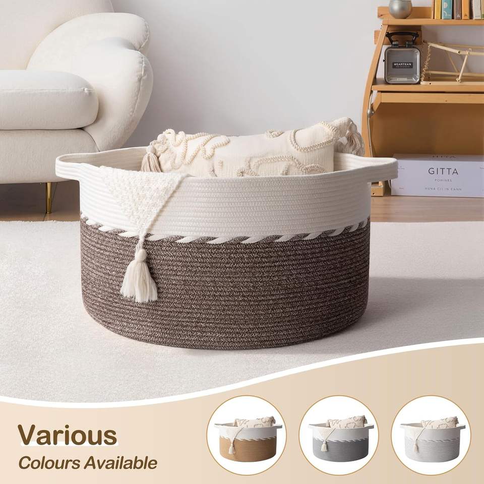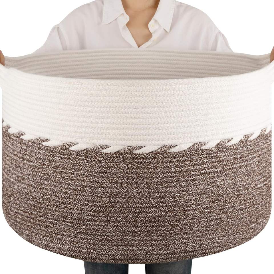 Grand panier avec poignée, panier à linge, bacs et boîtes de rangement pour couvertures, oreillers, jouets pour enfants, chiens - Marron et blanc