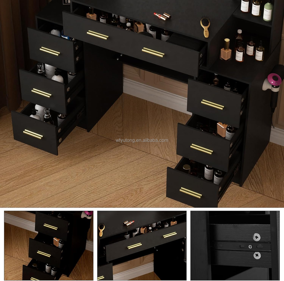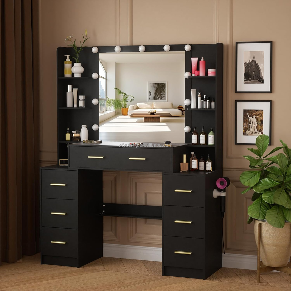 Grande coiffeuse noire à 8 tiroirs avec lumières LED, luminosité réglable et 3 températures de couleur, miroir en bois pour chambre à coucher