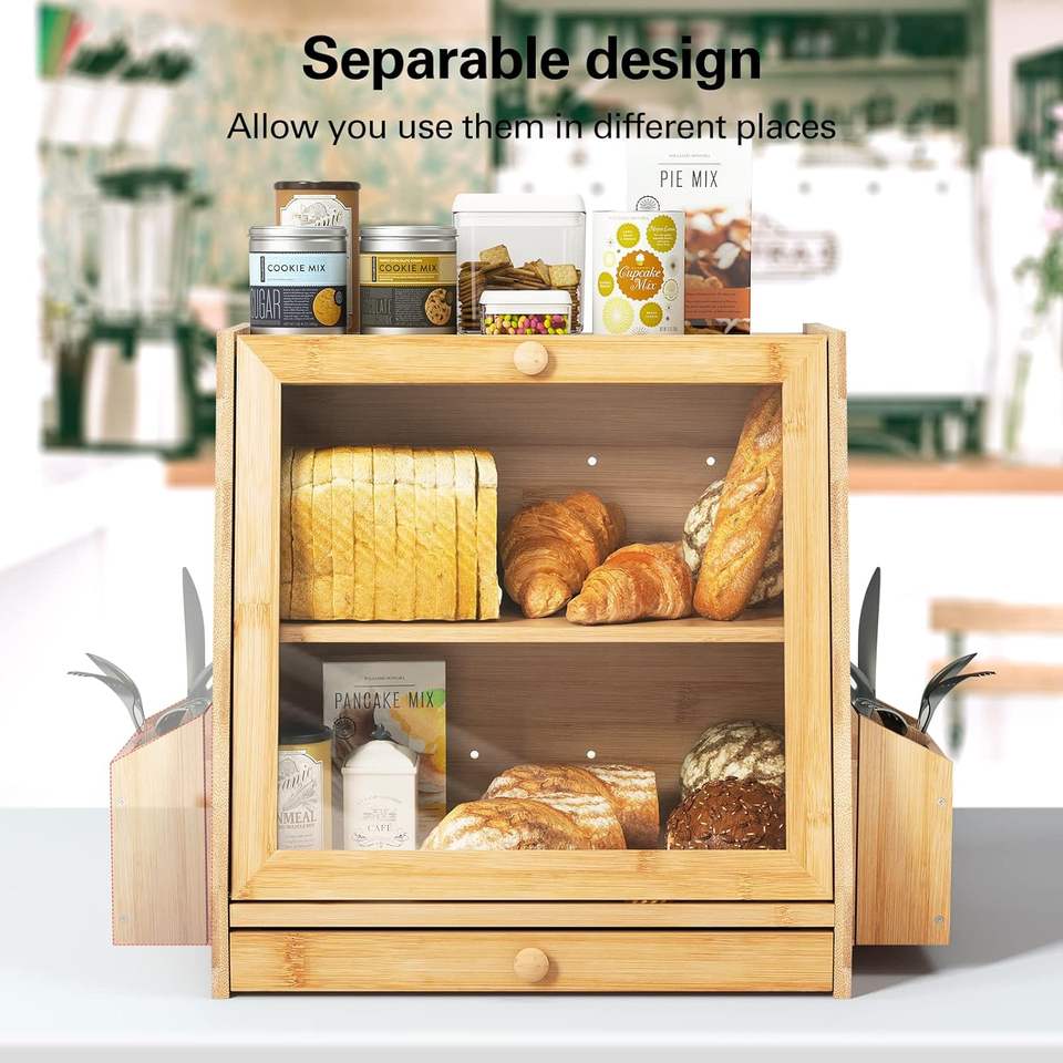 Grande boîte à pain pour comptoir de cuisine, double couche en bois de bambou, grande capacité de stockage de pain avec panneau de porte ondulé en acrylique