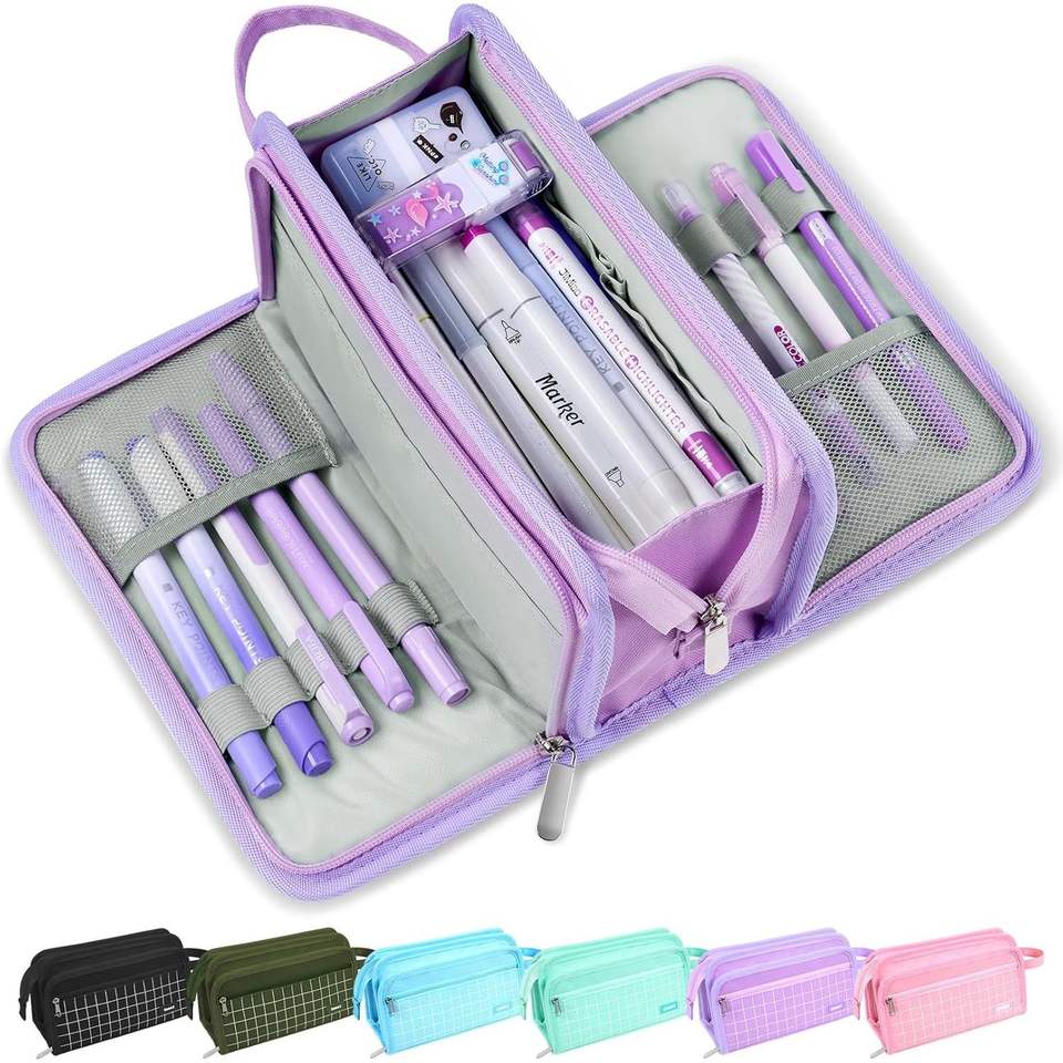 Étui à crayons en toile à grande capacité avec 3 compartiments, organiseur de papeterie portable avec fermeture éclair, sac à stylos mignon et pratique
