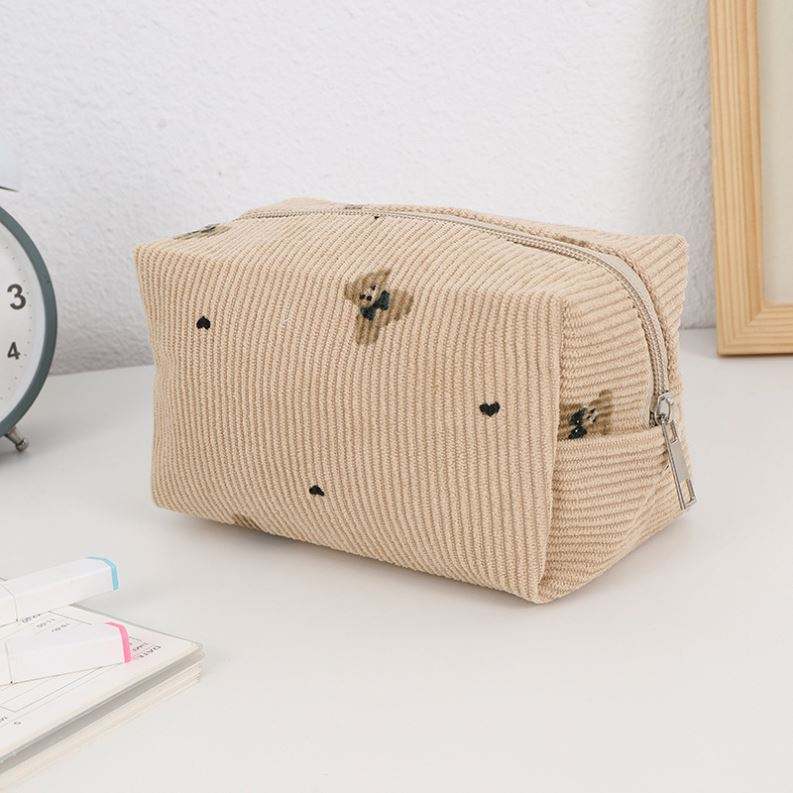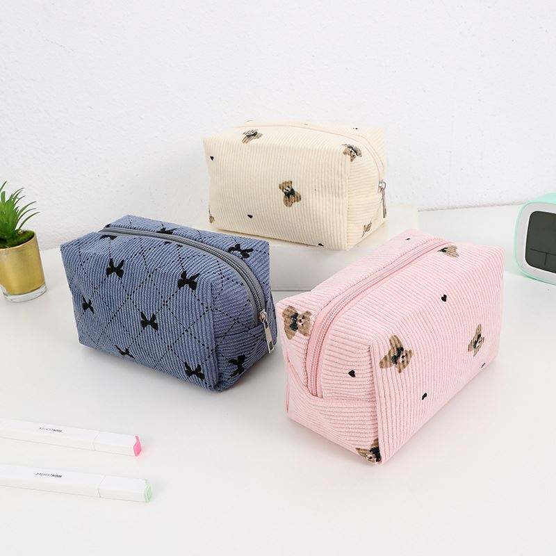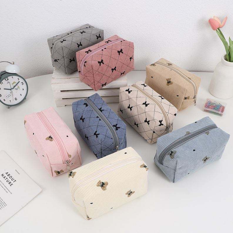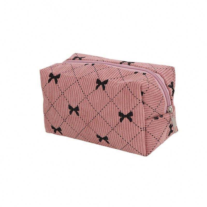 Grande trousse de toilette en velours côtelé personnalisée avec nœud mignon, grande capacité, fermeture éclair, pour femmes