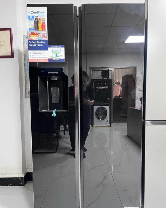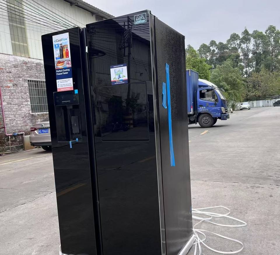 Distributeur d'eau douce côte à côte à double porte de grande capacité Panneau en verre noir Réfrigérateur ménager électrique en acier inoxydable