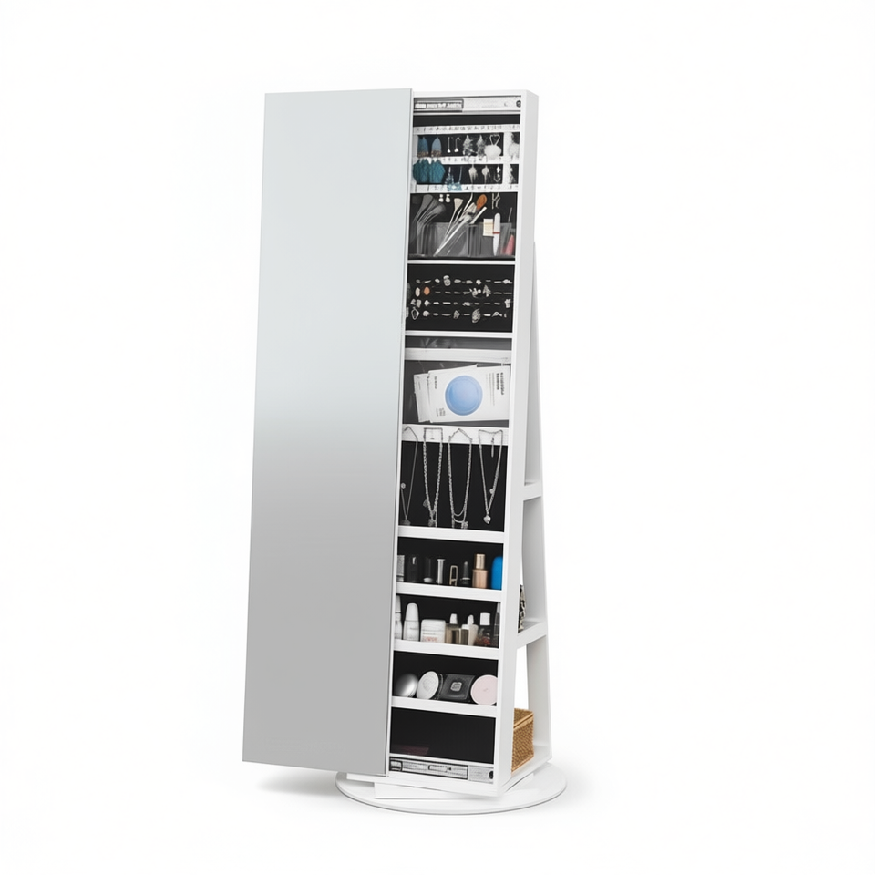 Armoire à bijoux verrouillable grande capacité avec miroir pleine longueur à 360 degrés et étagères de rangement multiples