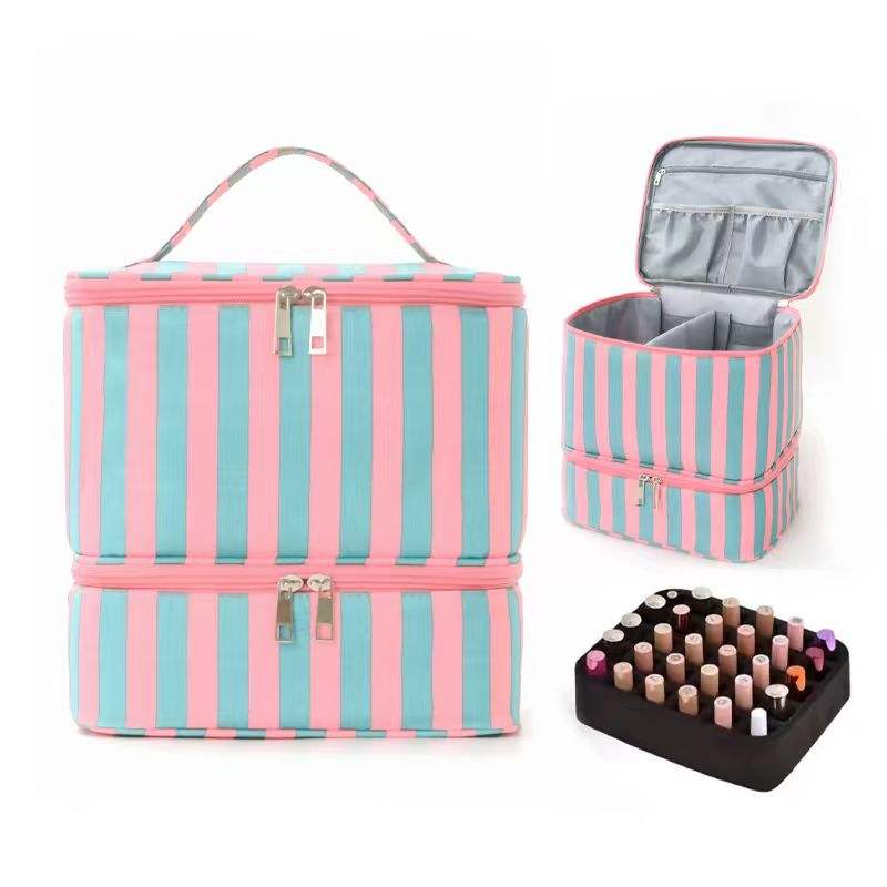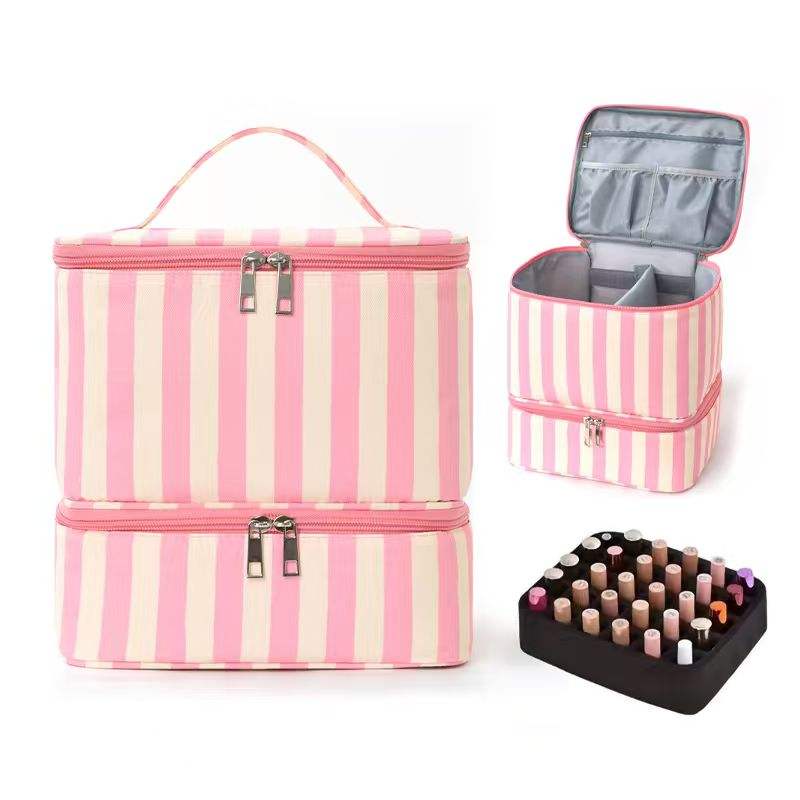 Large Capacity Multi-Compartment Fashion Zipper Portable 2-Tier Striped Polyester Cosmetic Organizer Makeup Bag for Travel