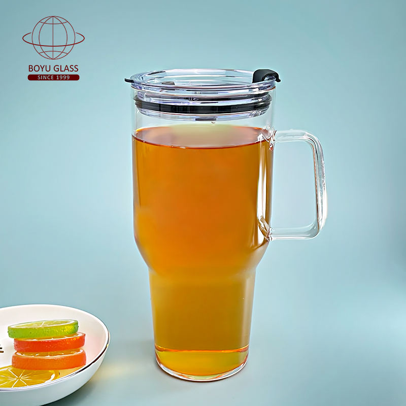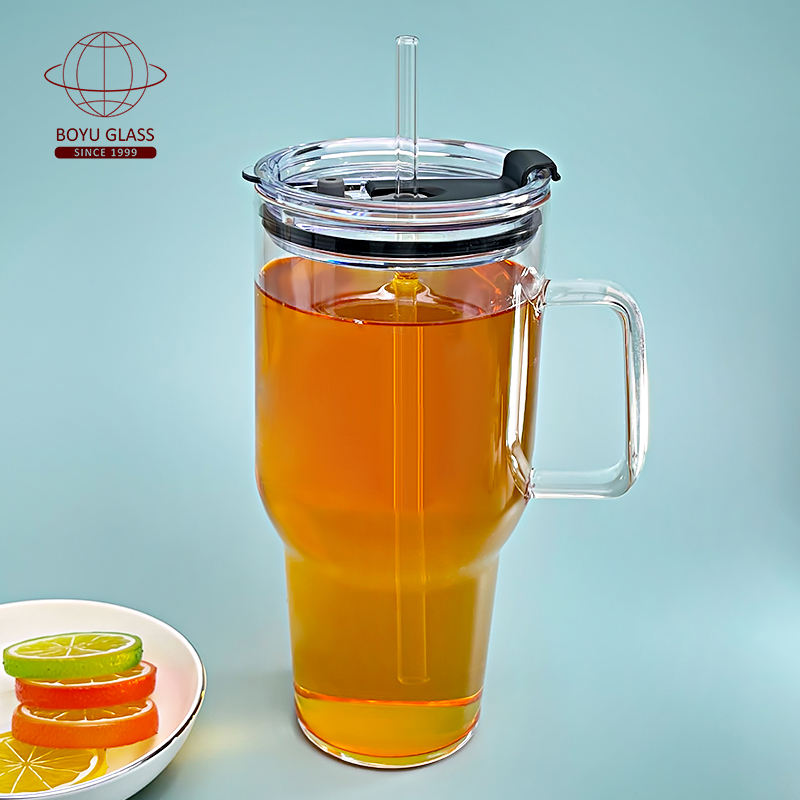 Tasse à eau transparente en verre rétro-texturé de grande capacité avec paille et couvercle intégrés