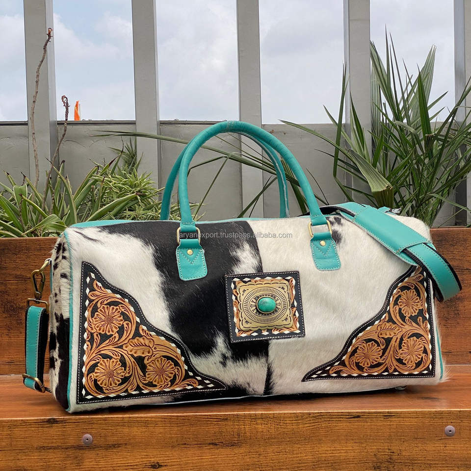 Tooled Cowhide Leather Turquoise Duffel Bag
