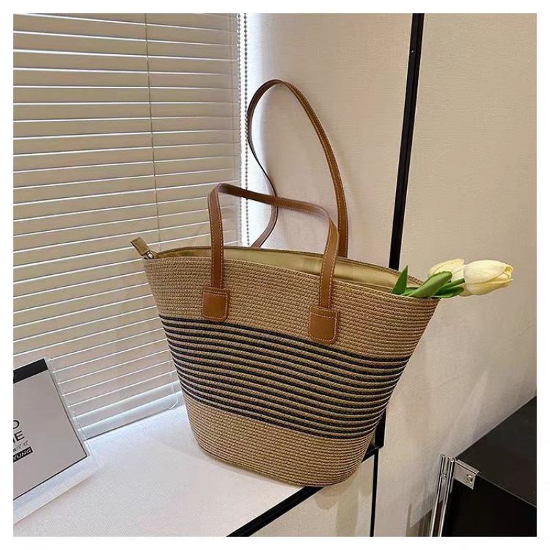 Large Capacity Woven Striped Straw Bag Summer Cross-Border Trade Handbag with PU Hand Travel Beach Vacation for Women Casual