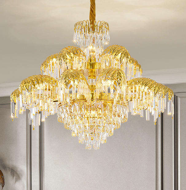 Grand lustre classique en laiton et cristal de palmier à 2 couches pour hôtel