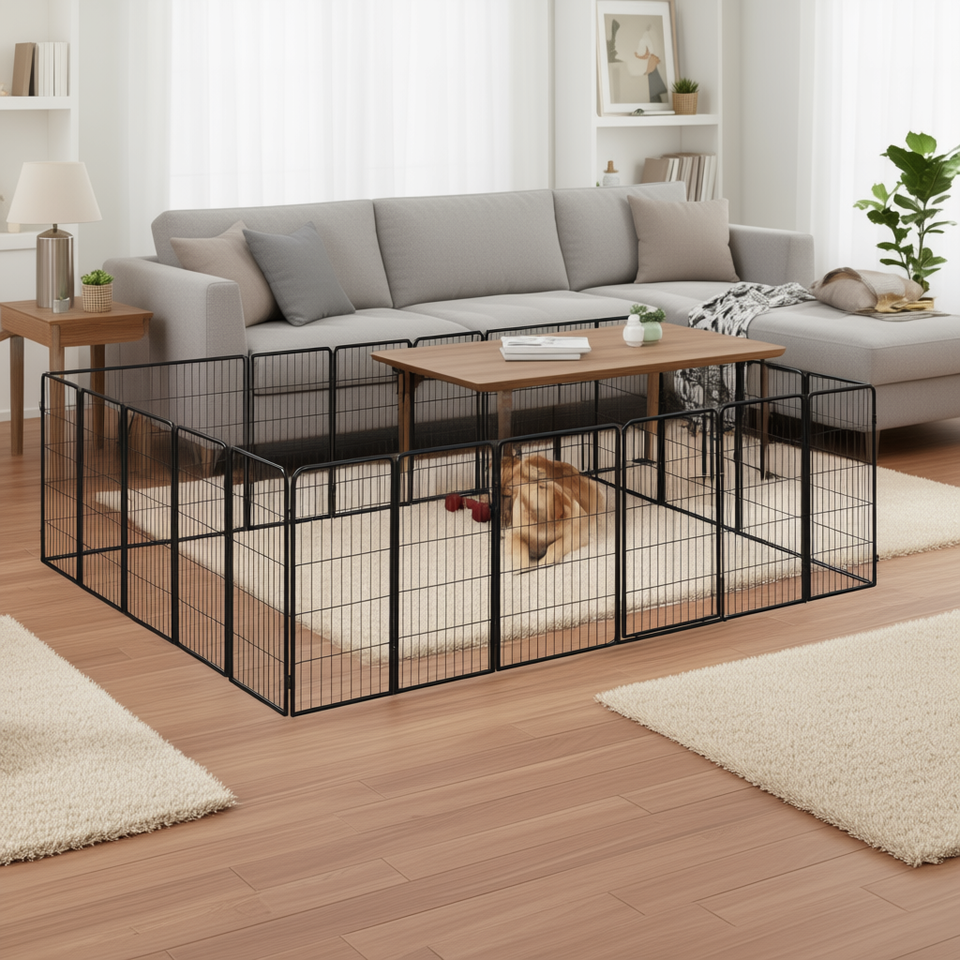 Grand enclos pliable pour chien en acier thermolaqué noir, portillon pour animaux de compagnie, style moderne rectangulaire pour intérieur