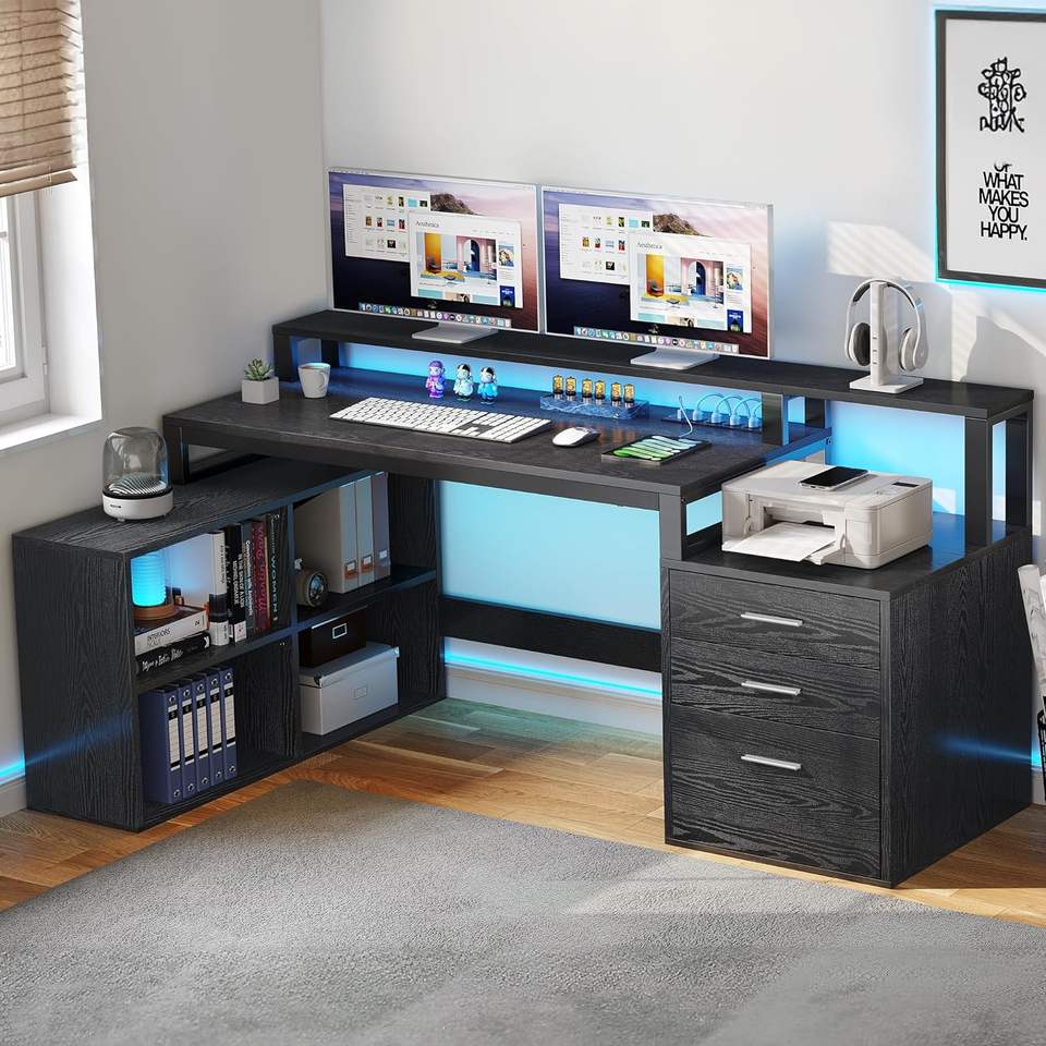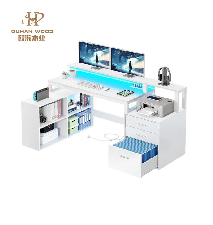 Grand bureau d'ordinateur en bois d'angle avec classeurs et imprimantes pliables Plate-forme de visite double