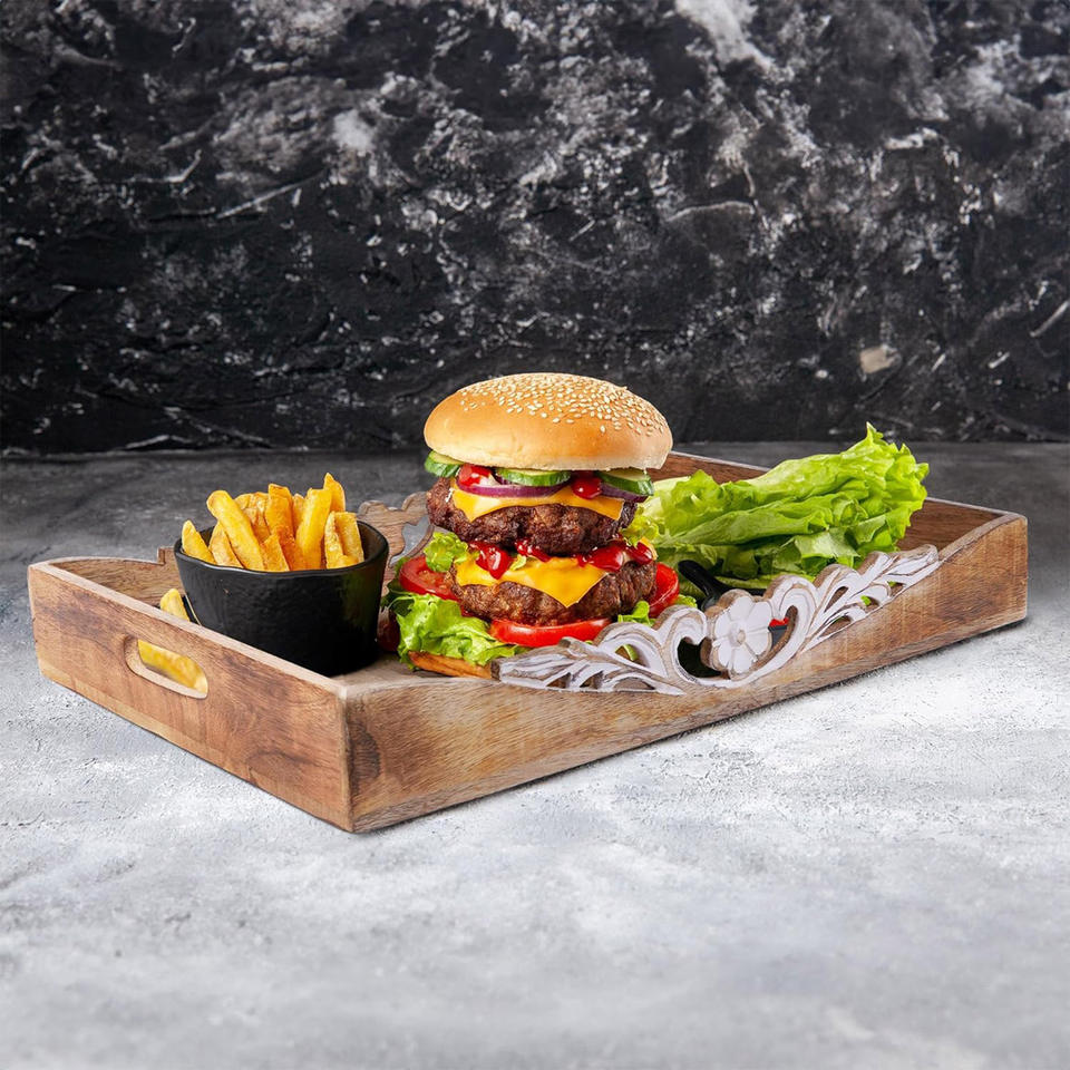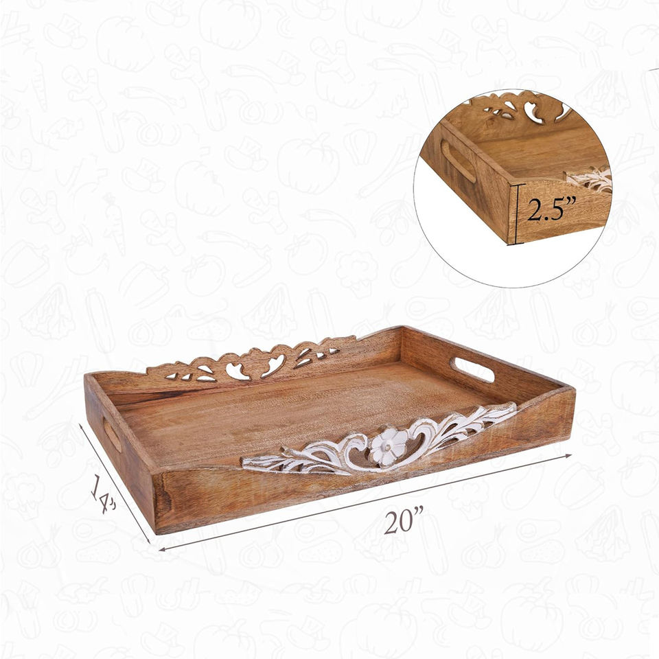 Grand plateau de service décoratif en bois de manguier avec poignées Plateau en bois sculpté à la main pour le petit-déjeuner au lit Fourniture en gros Acheteurs en vrac
