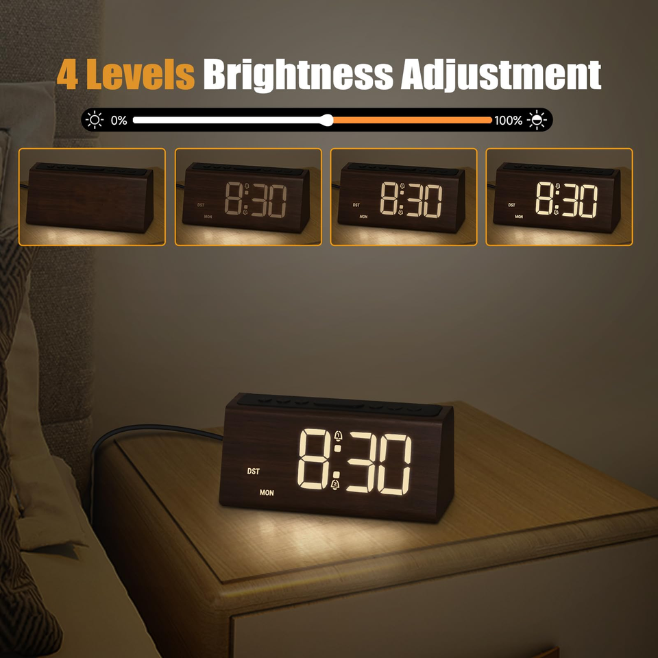 Large Digits 4-Level Dimmable Loud Alarm up to 95db Outlet Powered 5-minute Snooze User-Friendly Wooden Digital Alarm Clock