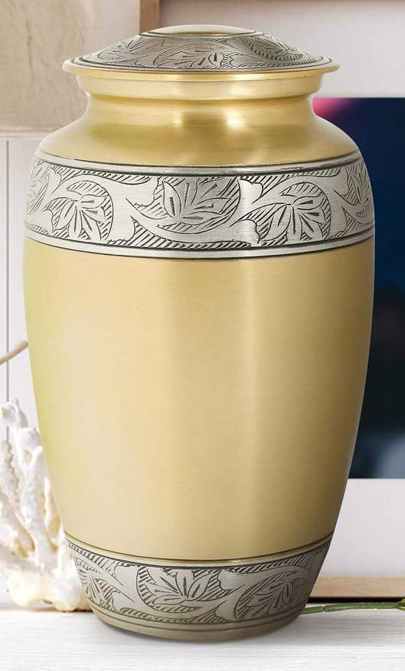 Large Handcrafted Gold Cremation Urn for Adults Elegant Modern Design with Beautiful Hand Engraved Detail for Funeral Burial