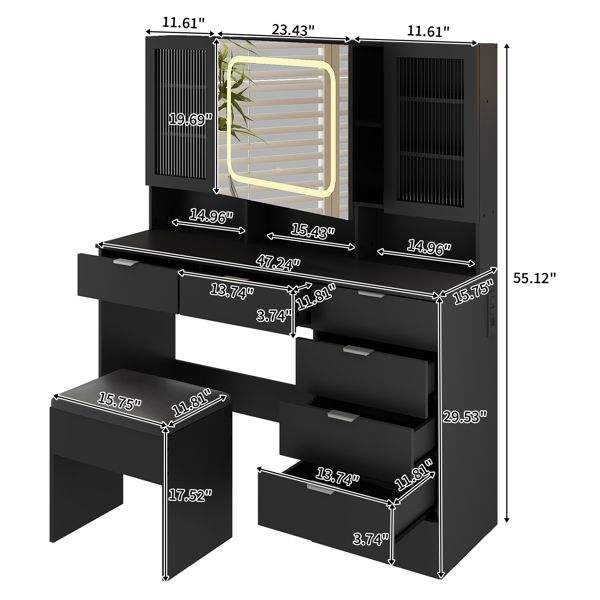 Large LED Lighted Mirror Makeup Vanity Table Set with Charging Station Glass Doors Drawers-for Your Daily Beauty Routine!