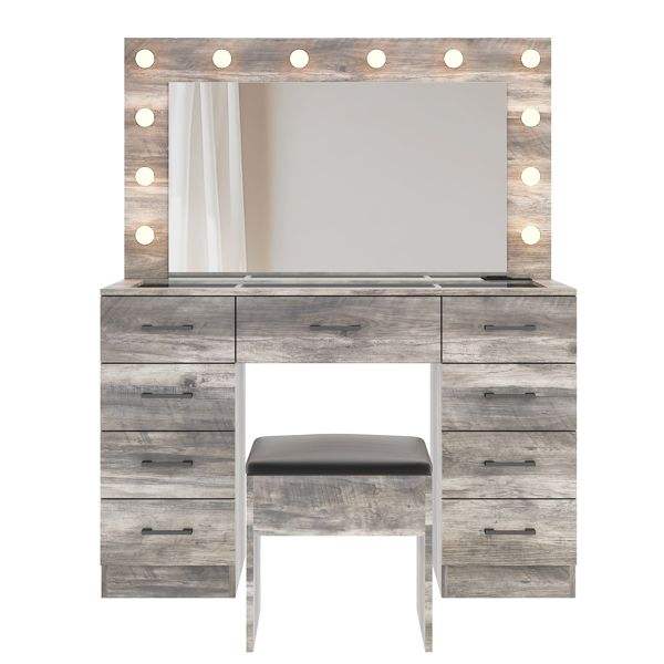 Grand miroir lumineux à 12 LED avec 9 tiroirs, table de maquillage avec plateau en verre et prise électrique