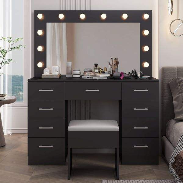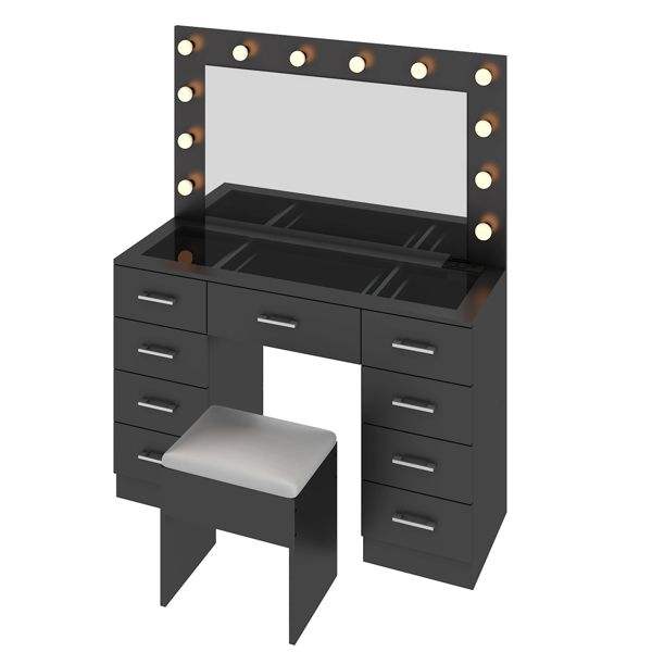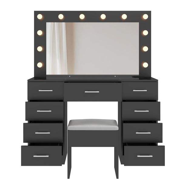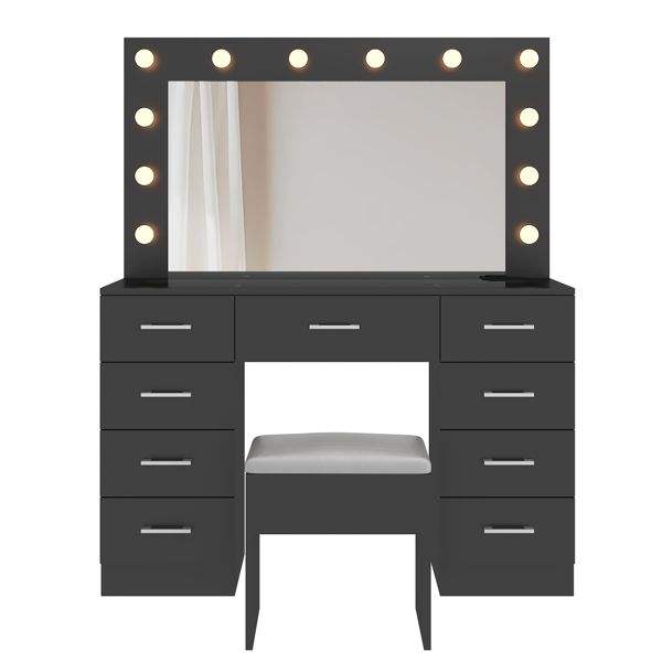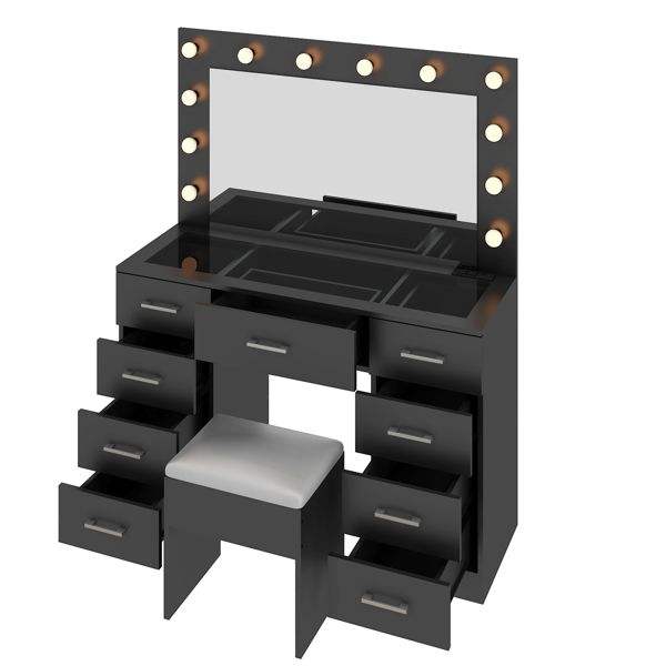 Large Lighted 12 LED Mirror Makeup Vanity Desk Set with 9 Drawers Glass Top Vanity Table with Power Outlet