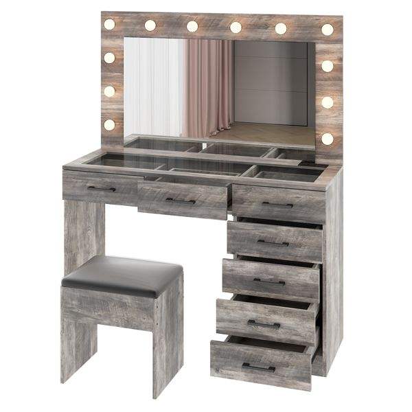 Grande coiffeuse lumineuse à 12 LED avec miroir, 7 tiroirs, plateau en verre et prise électrique - Table de maquillage élégante