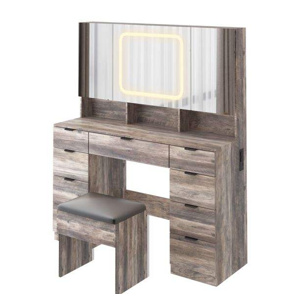 Large Makeup Vanity Table Set with 3 Opening LED-Lit Mirrors Full Storage Behind Mirror D Style Design