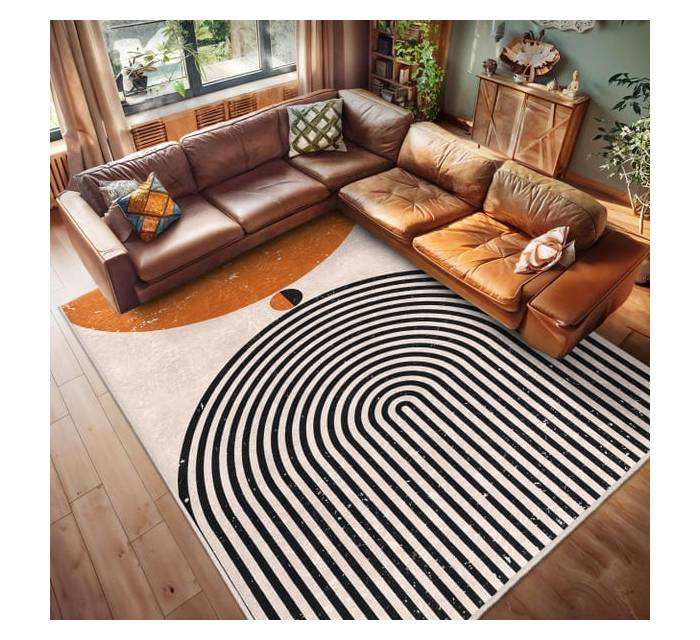 Grand tapis géométrique moderne imprimé en 3D, tapis décoratif contemporain aux lignes artistiques orange brûlé et noires pour chambre et bureau
