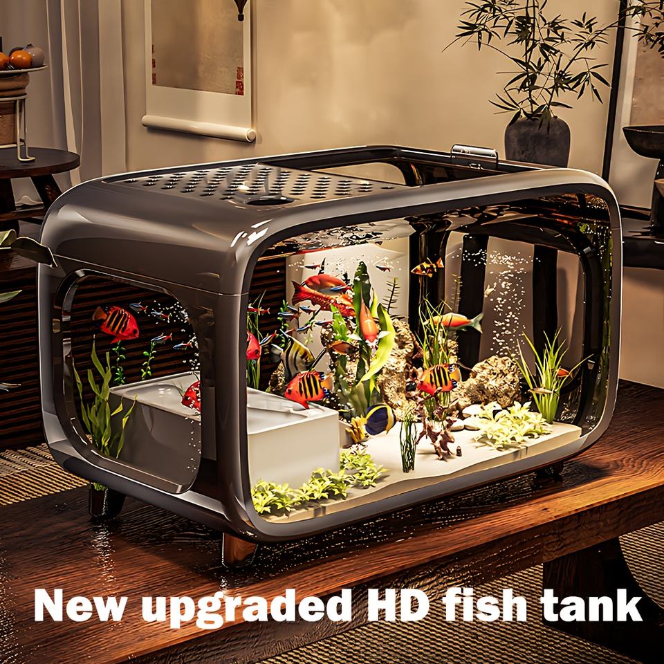 Grand aquarium panoramique transparent moderne, design rectangulaire intégré pour la décoration de bureau