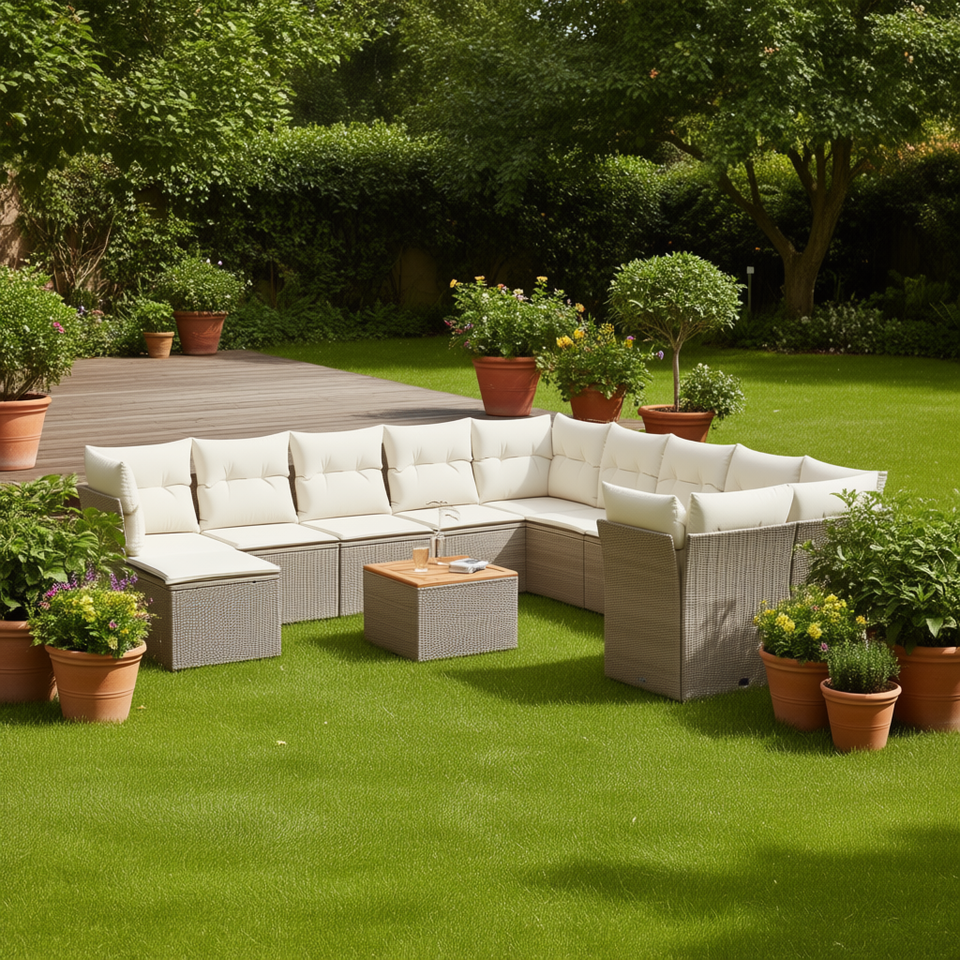 Ensemble de canapés de jardin modulaires en polyrotin beige 10 places, mobilier d'extérieur au design contemporain
