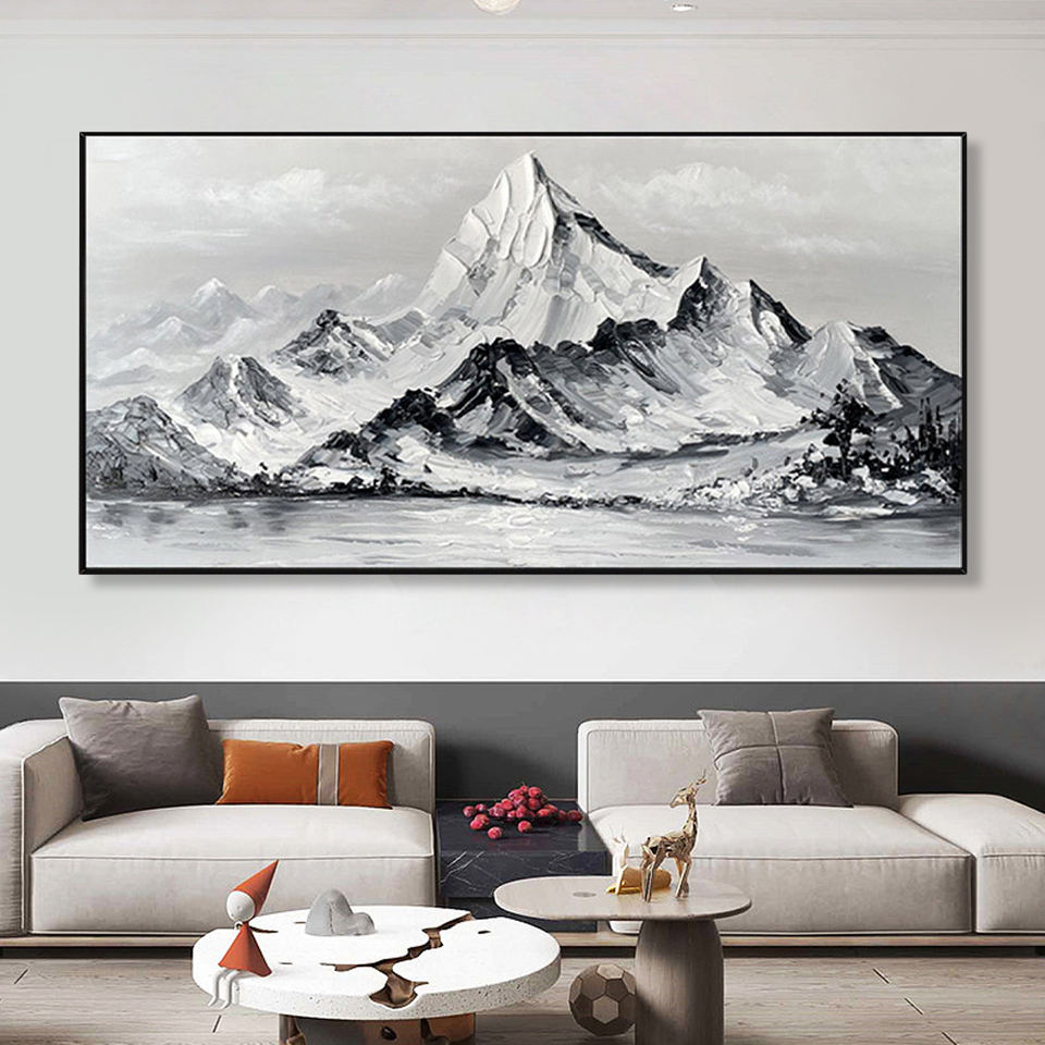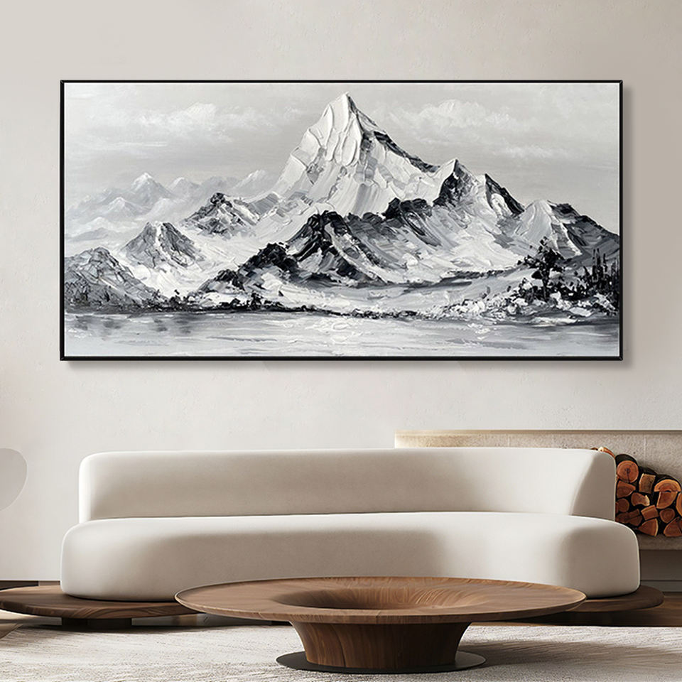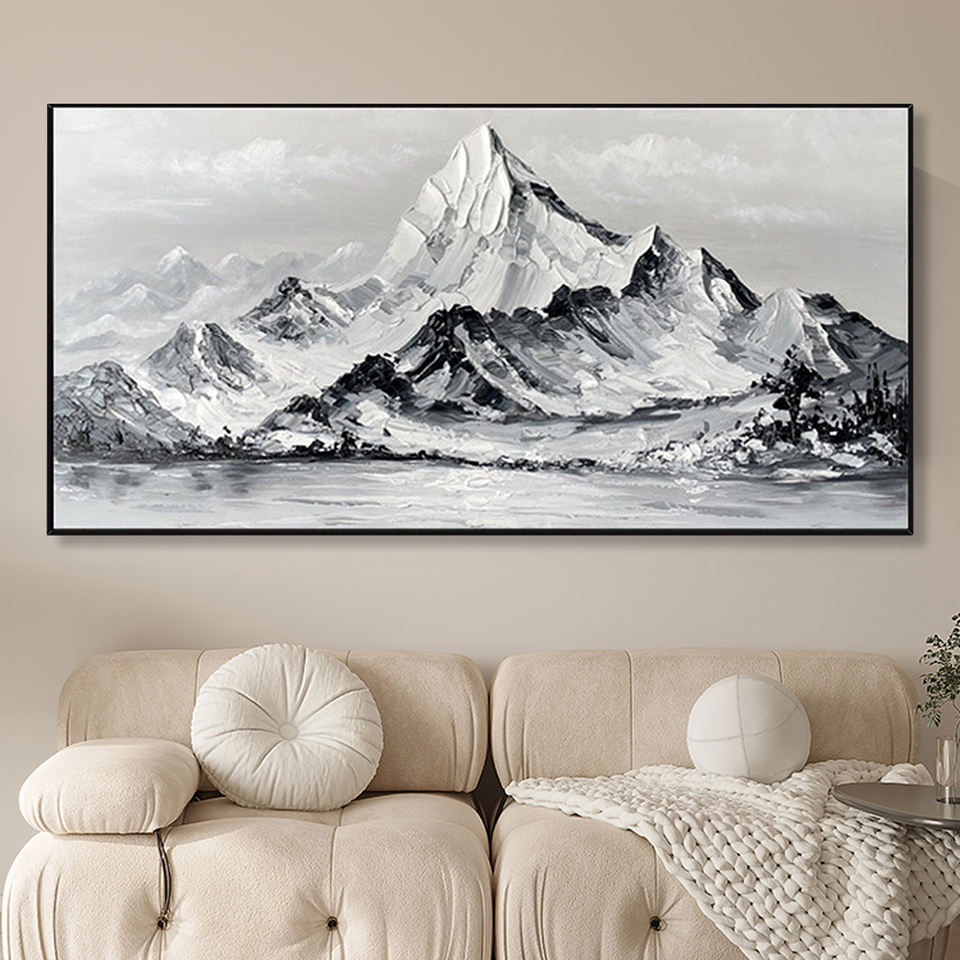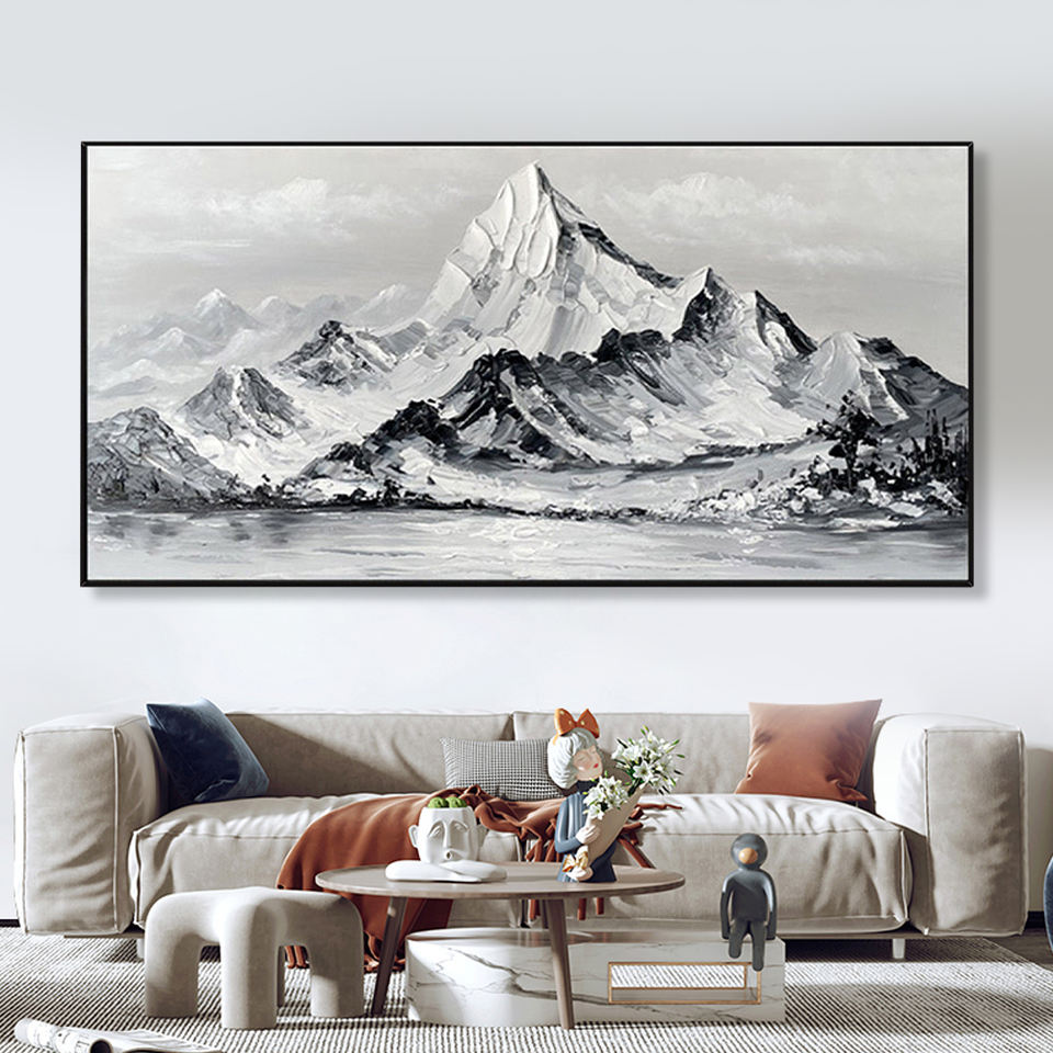 Grande peinture de paysage de montagne avec art de toile de couteau à palette noir et blanc arylique texturé sur cadre noir