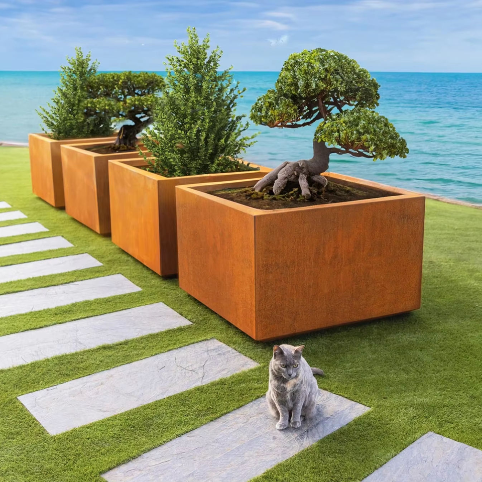 Grand bac à fleurs rectangulaire ou rond en acier corten, utilisé comme jardinière moderne d'extérieur, dimensions et design personnalisés