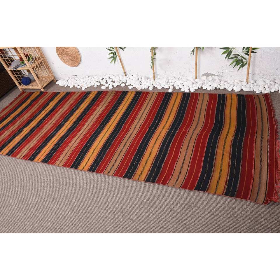 Grand tapis turc rustique rouge noir vintage en laine de 3.6x10,5 pieds avec motif patchwork de support en latex pour décoration de couloir ou de chambre