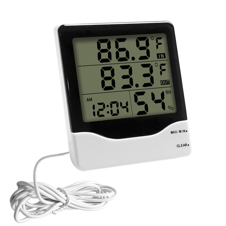 Thermomètre hygromètre numérique à grand écran LCD pour intérieur et extérieur avec horloge, mémoire des valeurs maximales et minimales et fil externe