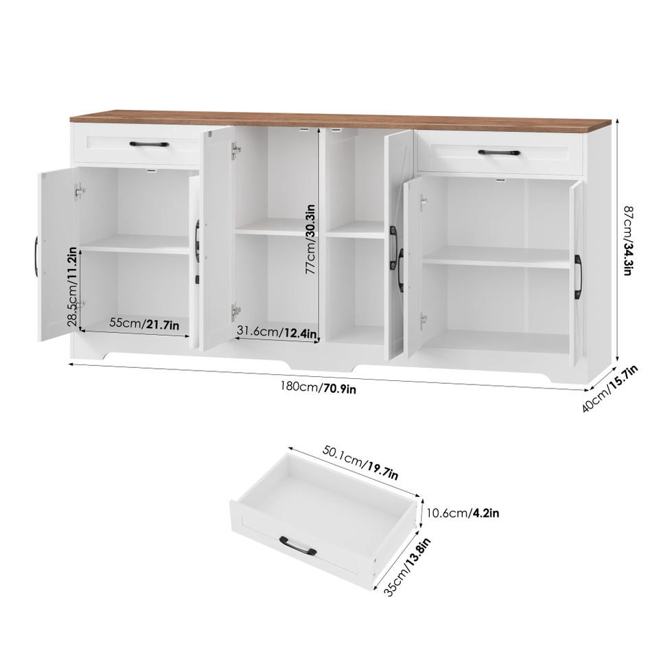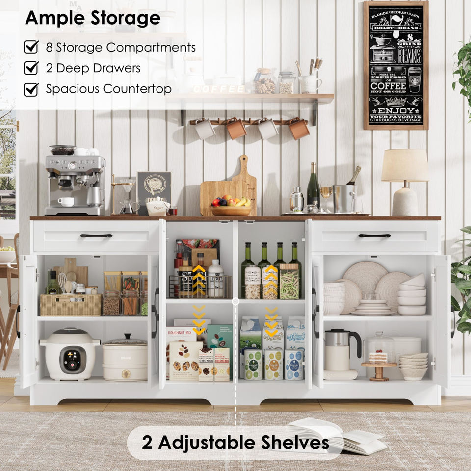 Grand buffet avec rangement, buffet de cuisine de style campagnard avec étagères réglables et 6 portes de grange