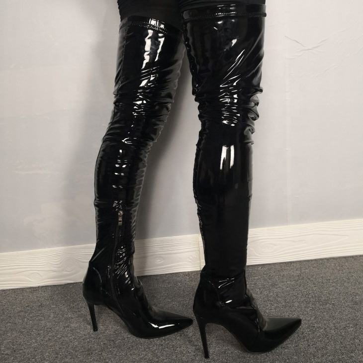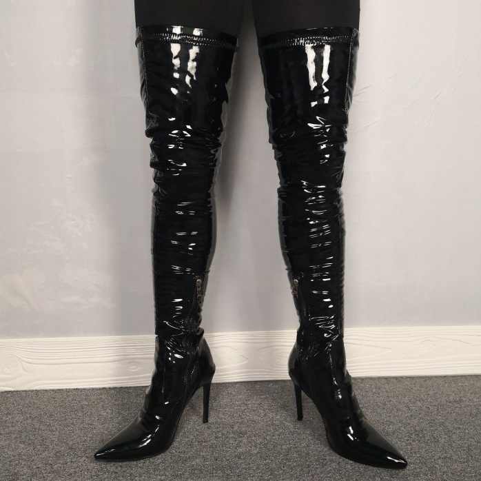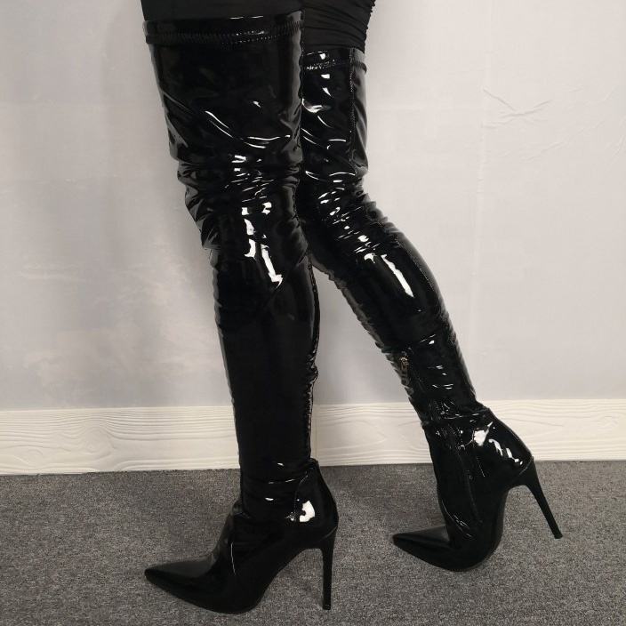 Bottes hautes pour femme, taille 47, ajustées, avec empeigne réfléchissante, fermeture éclair latérale, talon aiguille, bout pointu, longues, au-dessus du genou