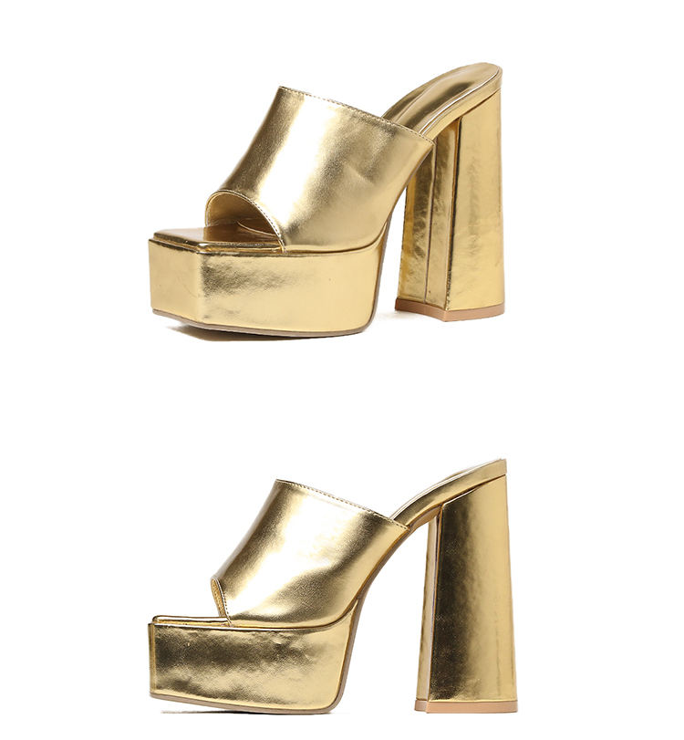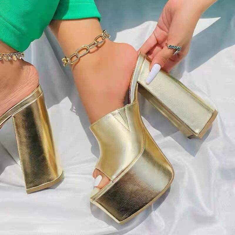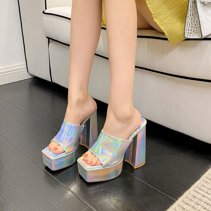 Sandales à talon très haut et épais, à bout carré, dorées, grande taille, et nouvelles pantoufles à talon épais argentées effet laser fantaisie