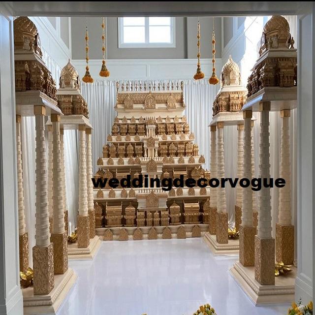 Mandap en fibre de mariage indien traditionnel de grande taille avec motif de défense d'éléphant sculpté et finition dorée pour la décoration de scène